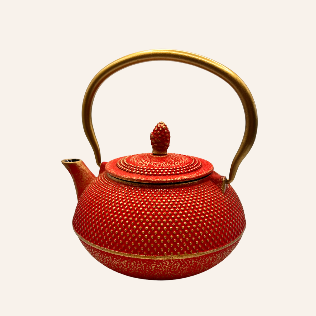 Eisen-Teekanne in rot mit goldenen Elementen. Mit Metallsieb, innen emailliert. Fassungsvermögen: 900ml
