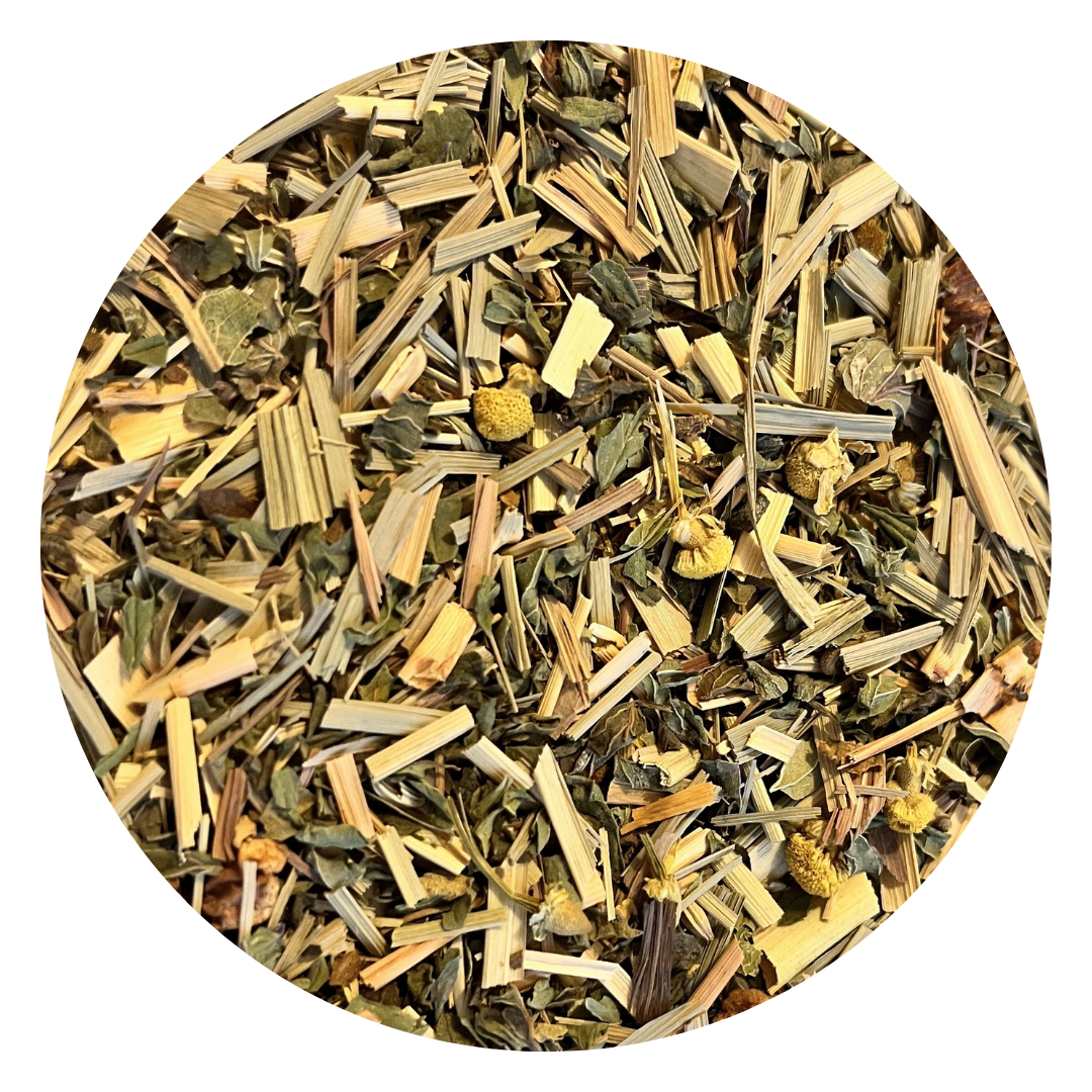 Zitronengras, Pfefferminze (30%), Apfelstücke, Kamillenblüten, Erdbeerblätter, Fenchel, Lindenblüten, Ringelblumenblüten