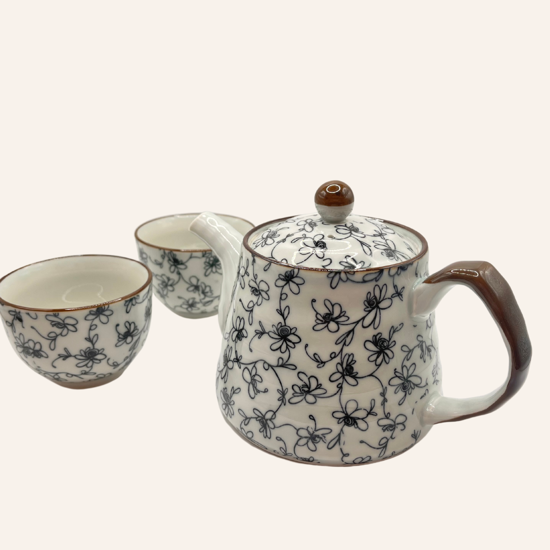 Japanisches Teeset bestehend aus 1 Porzellan Teekanne 500 ml mit festem Edelstahlsieb vor der Tülle und 2 Cups