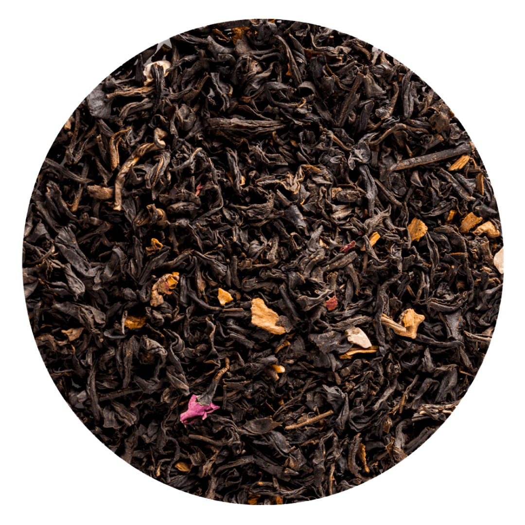 Schwarzer Tee (89%), Aroma, Mandelstücke, Zimtstücke, rote Rosenknospen, Rosenblütenblätter rot